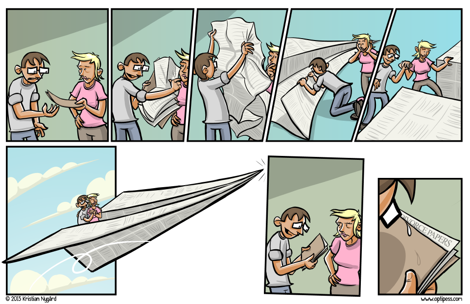 Paper Escape by Kristian on June 10, 2013 at 00:00 Chapter: Comic Here, fly away with this new comic strip! Liked it? Take a second to support Kristian on Patreon! └ Tags: pantomime, romance, someone dies inside