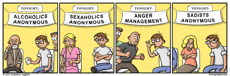 Heis in Sadists anonymous because he inflicted pain on others at the last three meetings. I.E. Giving the man at AA alcohol, eying the woman at Sexaholics, and starting a fight at Anger Management.